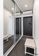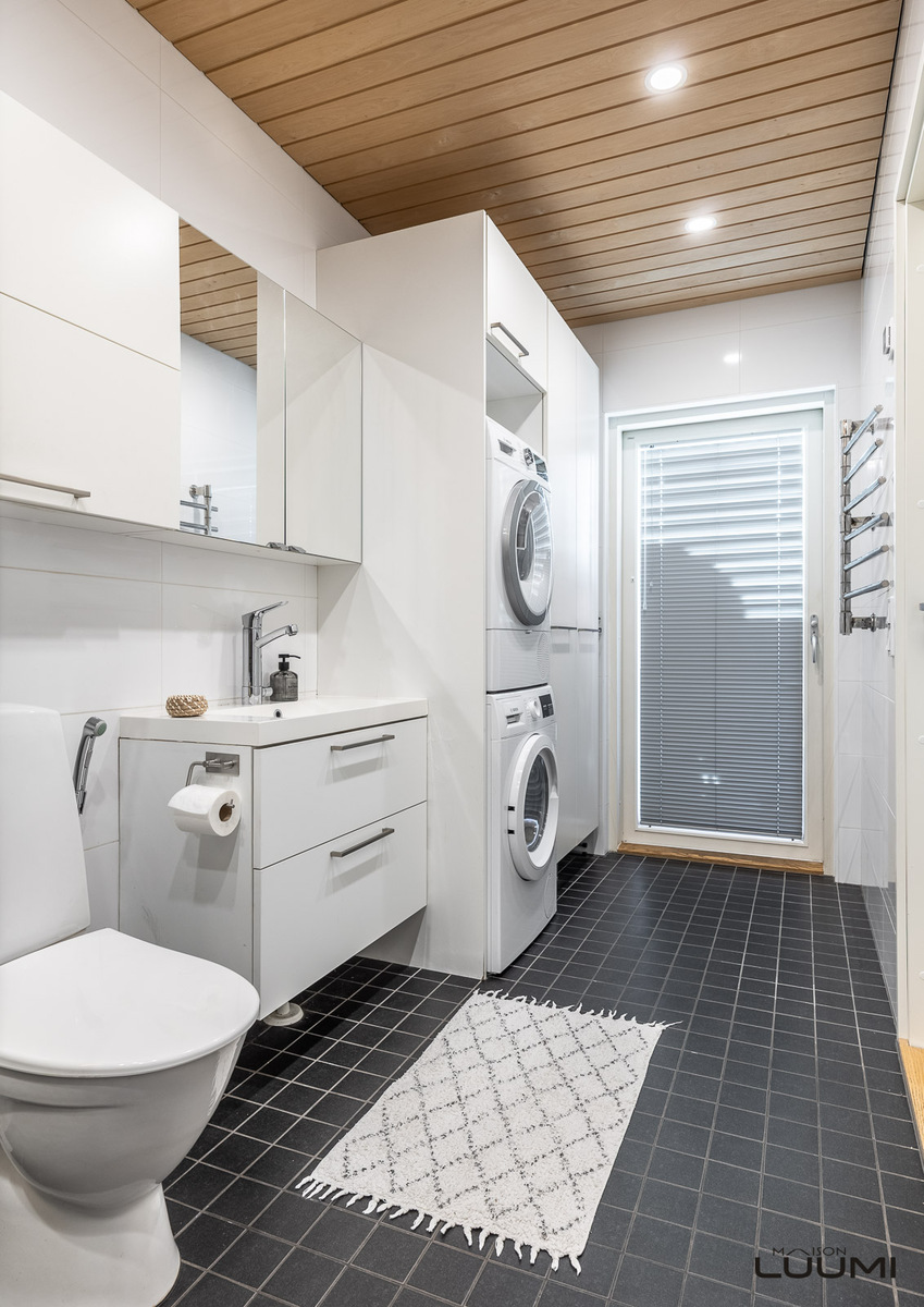 | Kuvaus: | Kodinhoitotila kylpyhuoneen yhteydessä. Pesukoneliitäntä, kaapistot sekä käynti terassille. |