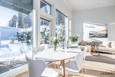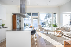 | Kuvaus: | Olohuone yhtenäistä ja valoisaa tilaa yhdessä avokeittiön ja ruokailutilan kanssa. Korkea huonekorkeus. |