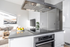 | Kuvaus: | A la Carten avokeittiössä saareke, aamiaiskaappi, apteekkarinkaappi, kaksi jää-/pakastinkaappiyhdistelmää, induktioliesi, erillisuuni, liesituuletin (hormi), astianpesukone (2026) ja kiinteät valaisimet. Työtasot Ylämaan graniittia. |
