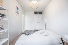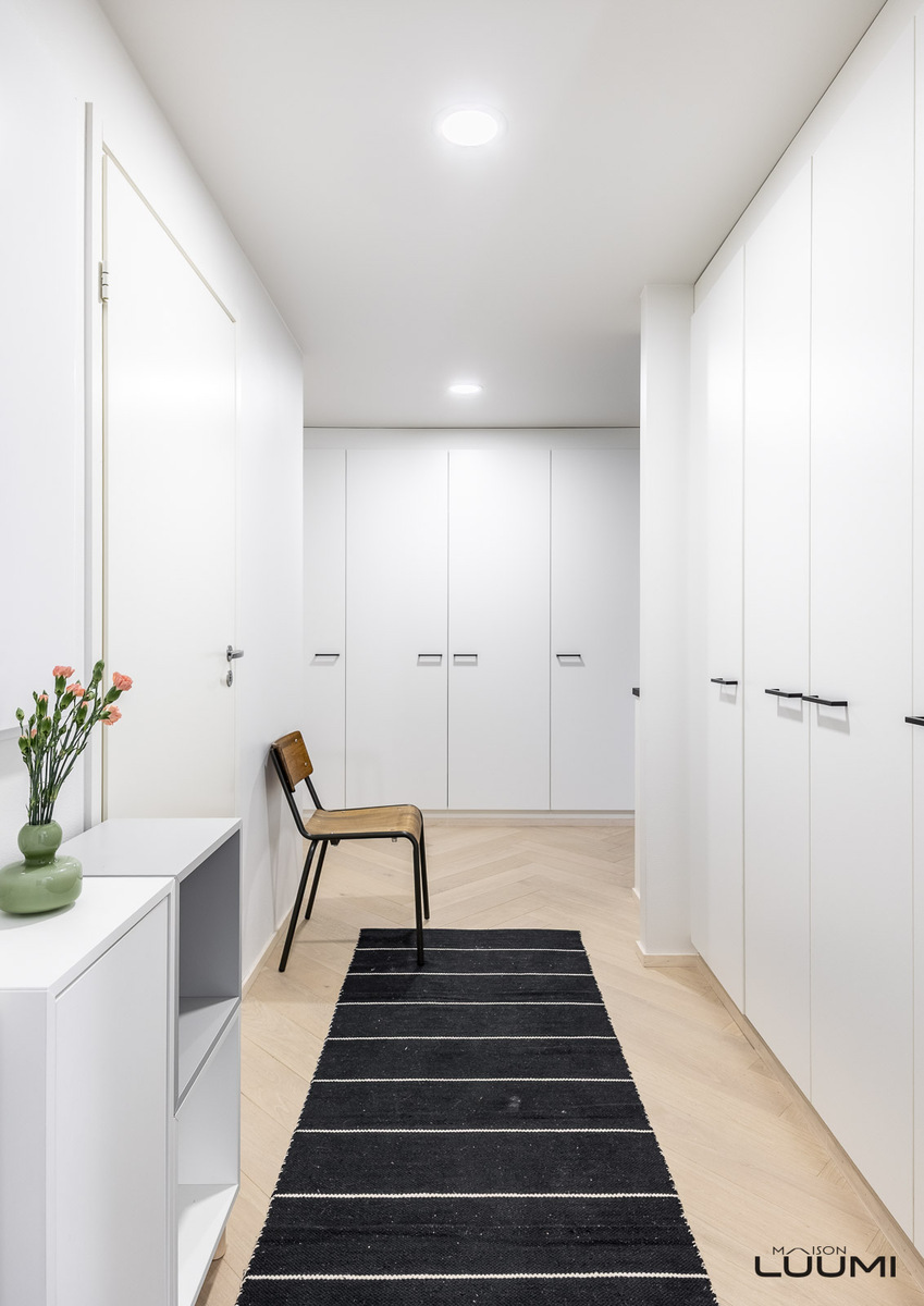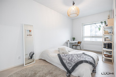 Tilavaan makuuhuoneeseen mahtuu hyvin myös työpiste, ja pyykkihuolto on sijoitettu kauniin kylpyhuoneen yhteyteen.