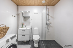 | Kuvaus: | Suihku, suihkuseinä, WC-istuin, allaskaappi pesualtaalla, peilikaappi, käsisuihku, pesukoneliitäntä. Sähkötoiminen mukavuuslattialämmitys. |