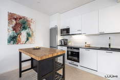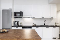 | Kuvaus: | Tyylikäs avokeittiö. Varusteina: rosterinen jääkaappi/pakastin, induktioliesi, erillisuuni, liesituuletin (suodatin), kalustemikro, astianpesukone, laminaattityötasot. Valoisa paikka ruokapöydälle. |